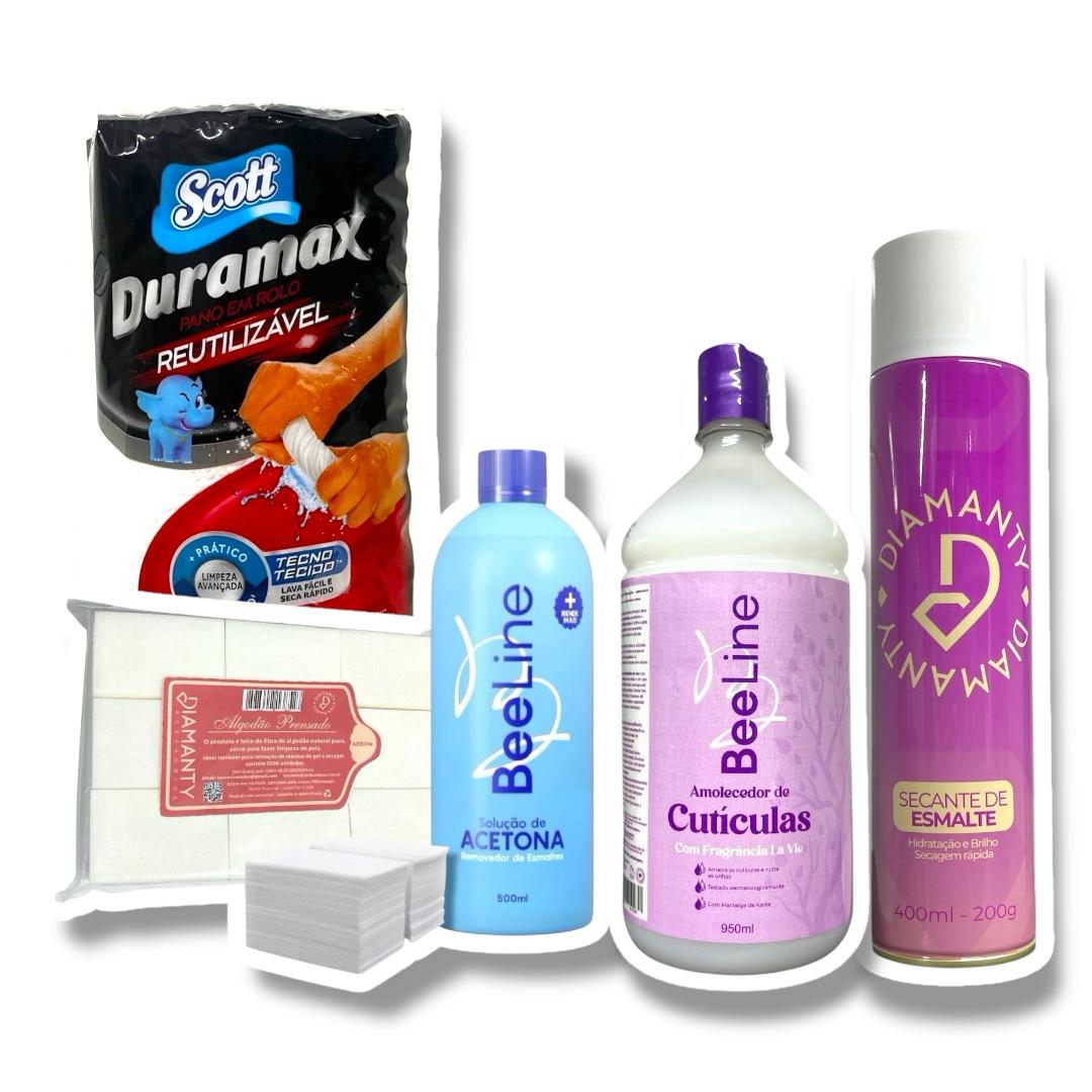 O kit perfeito para profissionais e para quem ama cuidar das unhas em casa. Com produtos de alta qualidade, facilita a remoção, hidratação e secagem do esmalte.
